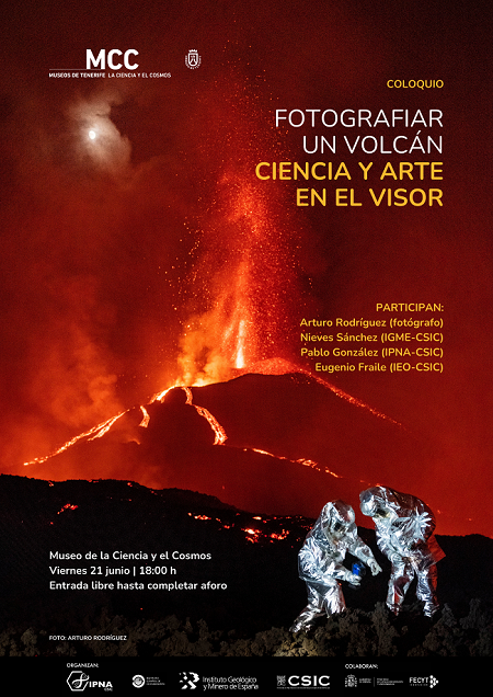 El volcán de Cumbre Vieja dejó impactantes y poderosas imágenes que inundaron todos los soportes durante meses. El palmero Arturo Rodríguez fue uno de los fotógrafos que mejor capturó con su cámara el Tajogaite y, sobre todo, la labor de la ciencia en esa oportunidad sin precedentes de estudiar en tiempo real un proceso eruptivo. Los lectores de National Geographic conocen de primera mano la maestría de Arturo Rodríguez y su habilidad para poner el arte al servicio de la ciencia. En este coloquio titulado ‘«Fotografiar un volcán: ciencia y arte en el visor» compartirá con el público material inédito de la erupción e imágenes exclusivas del interior de los tubos volcánicos del volcán, que aún están siendo estudiados por personal científico. Junto a él estarán Nieves Sánchez, del IGME; Eugenio Fraile, del IEO; y Pablo J. González, del IPNA, todos ellos investigadores del CSIC que se desplazaron hasta La Palma para estudiar in situ la erupción. Una ocasión única para disfrutar del maridaje entre ciencia y arte de la mano de sus protagonistas.PARTICIPANTES