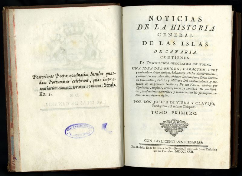 VIERA Y CLAVIJO, Joseph de. Noticias de la historia general de las Islas de Canaria contienen la descripción geográfica de todas […]. Madrid, Imprenta de Blas Román, 1772