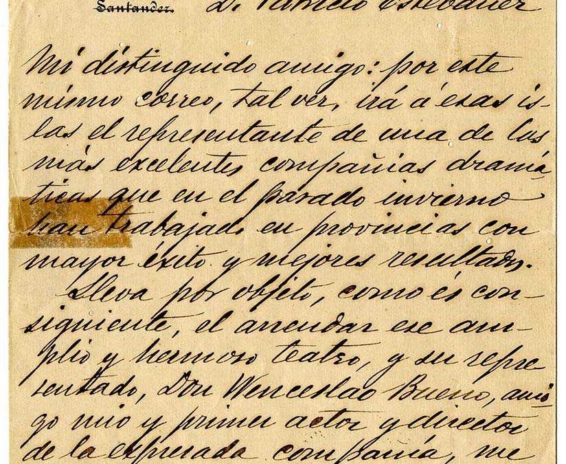 Destacamos para este Intemporal una carta que dirige Benito Pérez Galdós a Patricio Estévanez el 13 de agosto de 1896. En ella Galdós informa a Patricio que Wenceslao Bueno, director de una importante compañía teatral, viaja a Tenerife con la intención de arrendar el teatro. La carta puede verse en la actual muestra documental del CEDOCAM: Galdós: 100 años en 100 obras del CEDOCAM.