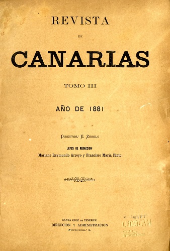 El CEDOCAM muestra esta semana en su sección Intemporales el tercer tomo de la publicación Revista de Canarias correspondiente al año 1881. Esta interesantísima revista literaria y científica, dirigida por Elías Zerolo, apareció en La Laguna el 8 de diciembre de 1878. Su formato era de libro y la periodicidad era quincenal.