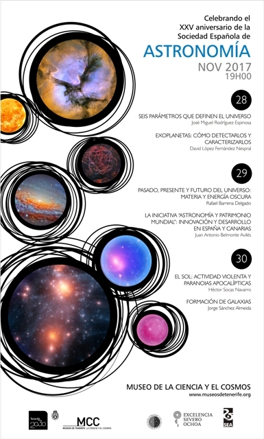 Este año se cumple el 25 aniversario de la creación de la Sociedad Española de Astronomía, la organización que engloba a los astrónomos profesionales de nuestro país. El Museo de la Ciencia y el Cosmos, y el Instituto de Astrofísica de Canarias se suman a las celebraciones que se están realizando en toda España con un mini-maratón de seis charlas divulgativas impartidas por otros tantos investigadores del IAC. Las conferencias están programadas para los días 28, 29 y 30 de noviembre, dos cada día, y ofrecerán una panorámica actual de la investigación astrofísica en temas que abarcan desde el Sol y los exoplanetas hasta la cosmología.