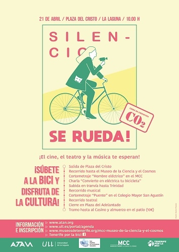 El sábado 21 de abril nos movemos en La Laguna con «Silencio, se Rueda», actividad para los amantes del ocio, la cultura y la bicicleta. La Asociación Tinerfeña de Amigos de la Naturaleza, el Museo de la Ciencia y el Cosmos, la Universidad de La Laguna y Tenerife por la Bici te invitan a participar de esta experiencia diferente.
