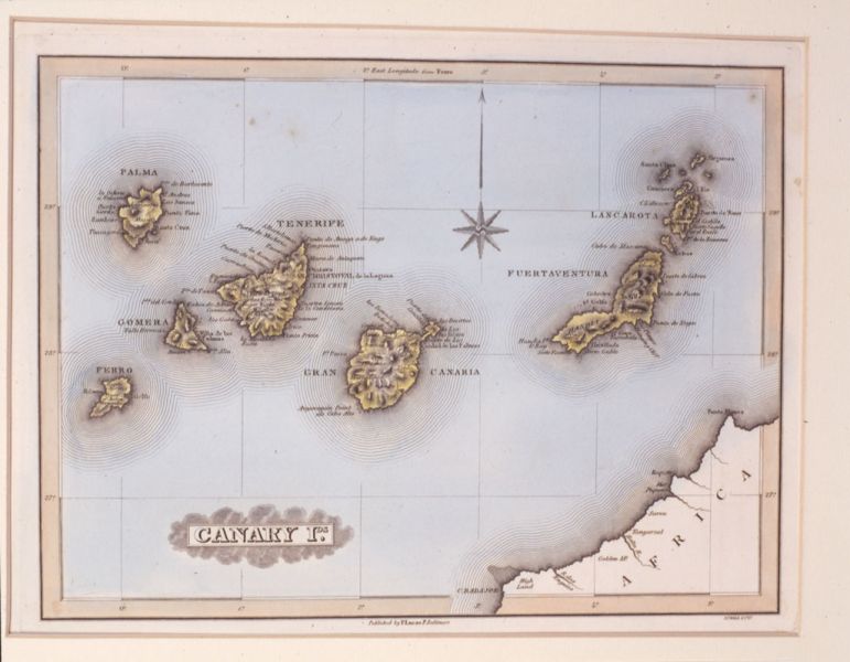 Mapa de las Islas Canarias y de una pequeña parte de África. Incluye el meridiano 0 en la isla de El Hierro. A color. Publicado por Lucas Jr. Baltimore. R.T. Welch & Cº Se.