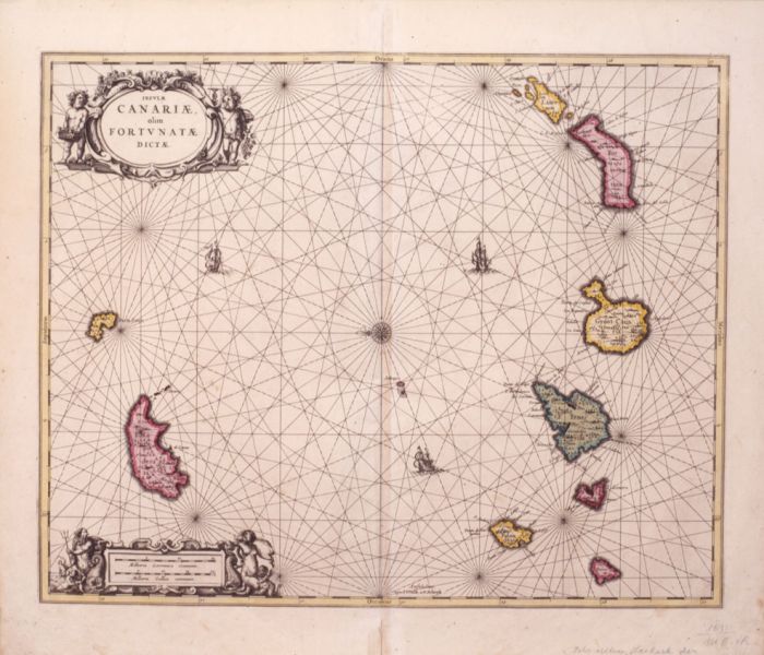 Mapa de las Islas Canarias, en otro tiempo llamadas de la Fortuna. Incluye la isla de Madeira y Porto Santo. Atribuido a Volk & Schenk. A color