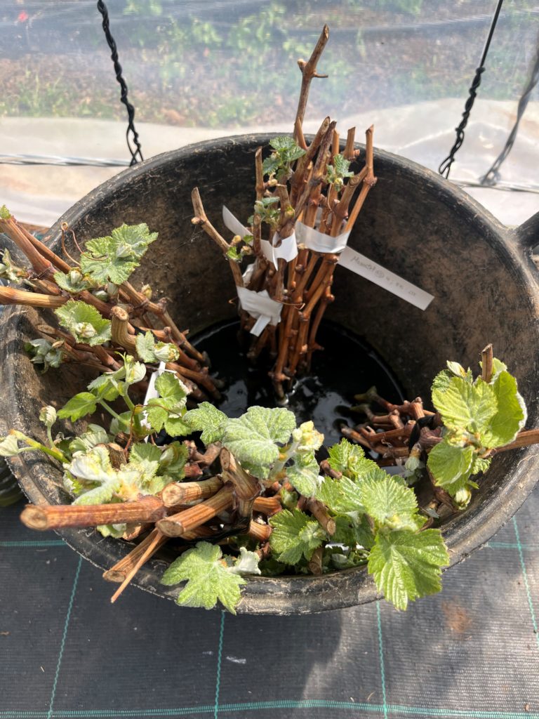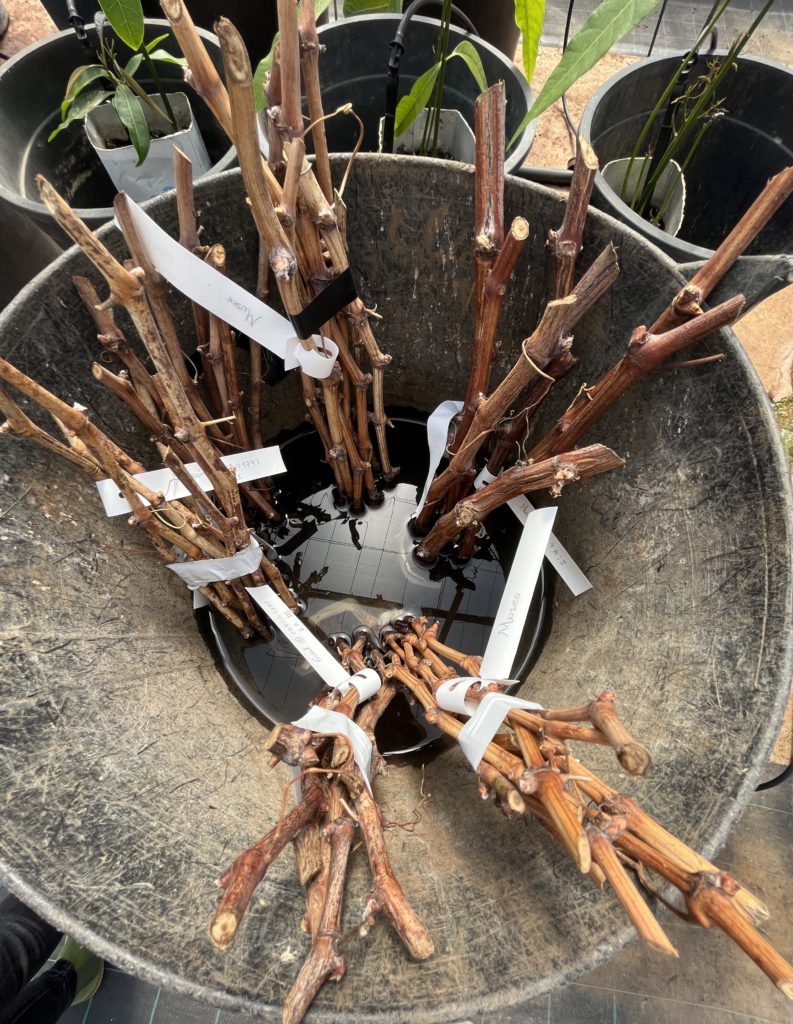 En estos días, las cepas fruto de la poda realizada por el personal del museo, en el menguante lunar de febrero, y otras cepas nuevas solicitadas al Centro de Conservación de la Biodiversidad Agrícola de Tenerife (CCBAT) para la renovación de algunas variedades, se encuentran sumergidas mediante sistema hidropónico en el invernadero tipo canario integrado en nuestras instalaciones. Enraizando, a la espera de ser trasladadas a la mesa de reproducción en macetas con sustrato, se preparan para su incorporación en un futuro cercano a los cultivos de la Casa de Carta.