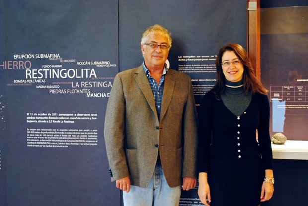Amaya Conde, Presidenta del Organismo Autónomo de Museo y Centros del Cabildo de Tenerife y Lázaro Sánchez-Pinto, Director del Museo de Ciencias Naturales de Tenerife, presentaron hoy, día 22 de diciembre, una exposición sobre las restingolitas en la que se exhibe varios ejemplares de este nuevo material volcánico, desconocido hasta el momento.