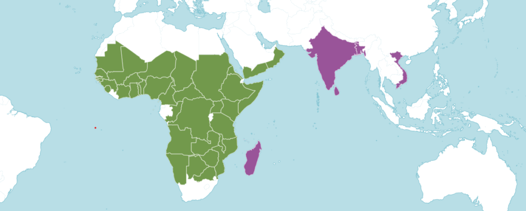 Distribución: Adansonia digitata crece en varias regiones del continente africano. En numerosas regiones cálidas, como Bangladesh, Comoras, India, Madagascar, Mozambique, Sri Lanka o Vietnam ha sido introducida (Bell et al., 2015).