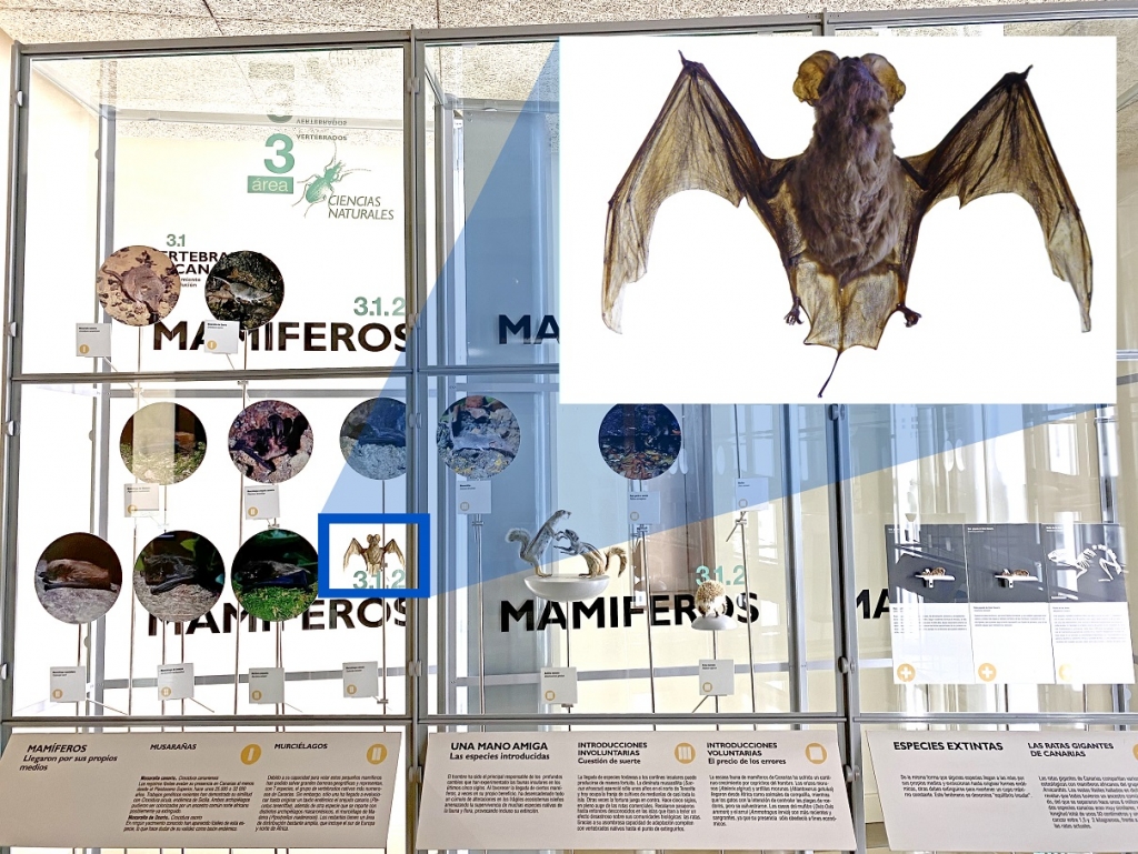Una subespecie de Barbastella barbastellus (Schreber, 1774), endémica de Canarias, es el murciélago canario de bosque, Barbastella barbastellus guanchae, Trujillo, Ibáñez & Juste, 2002, que se distribuye por Tenerife y La Gomera (Trujillo, 2002). También el endemismo macaronésico, Pipistrellus maderensis (Dobson, 1878), llamado murciélago de Madeira, presente en los archipiélagos de Madeira y Canarias (en este último caso en las cuatro islas occidentales, Tenerife, La Gomera, La Palma y El Hierro, donde ocupa casi todos los hábitats, incluso aprovechando alumbrado de pueblos y caseríos para capturar sus presas), aunque recientemente también ha sido citado en Azores (isla de Santa María) (Trujillo y González, 2011). Los otros cuatro quirópteros son: el murciélago rabudo, Tadarida teniotis (Rafinesque, 1814), el más grande en Canarias, que puede alcanzar una envergadura de unos 40 centímetros, del que pueden ver un ejemplar expuesto en las salas del Museo de Ciencias Naturales de Tenerife (MUNA), foto 1, en concreto en las salas de vertebrados terrestres y que está presente en Gran Canaria, Tenerife, La Gomera, La Palma y El Hierro (Hutterer, 1989). El nóctulo pequeño, Nyctalus leisleri leisleri (Kuhl, 1817), que habita en Tenerife y en La Palma (en Canarias) (Trujillo, Barone y González, 1988), así como en Azores y Madeira. El murciélago de borde claro, Pipistrellus kuhlii (Kuhl, 1819), presente en Gran Canaria, Fuerteventura y ocasionalmente avistado también en Lanzarote. Por último, el murciélago montañero, Hypsugo savii (Bonaparte, 1837), que gusta de grietas y fisuras y se encuentra en Canarias (El Hierro, La Palma, La Gomera, Tenerife y Gran Canaria) (Trujillo, Barone y González, 2012) Madeira y Cabo Verde. No obstante, recordemos que hace tiempo, a esta fauna, se añadió alguna que otra especie, caso del zorro volador egipcio (Rousettus aegyptiacus), exótico, introducido, portador de patógenos (caso de la rabia) (Wellenberg et al., 2002) e invasor que, aunque logró una población asilvestrada en Tenerife (año 2000), ha sido erradicado en las Islas (Trujillo, 2006, 2009).