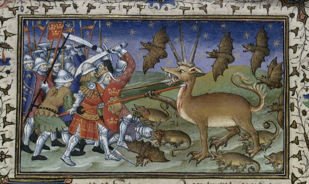 FOTO 4.- Murciélagos presentes en manuscritos iluminados del Medievo. Le Livre et le histoire du bon roy Alixandre, libro ilustrado que data de 1420 y narra la historia de Alejandro Magno y sus combates con animales enigmáticos