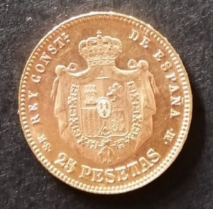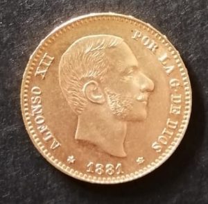 FOTO 1: Anverso Veinticinco pesetas, denominada también “Alfonsina”. Alfonso XII, 1881. Oro.