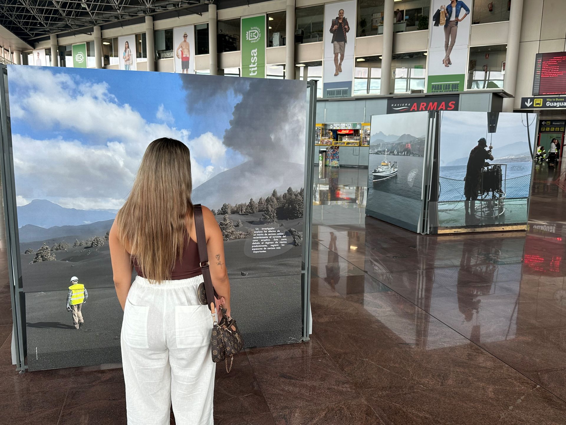 Desde el pasado 28 de julio, los usuarios del Intercambiador de Transportes de Santa Cruz de Tenerife podrán disfrutar de una parte de la exposición Ceniza y lava. Revelaciones científicas junto al volcán gracias a la instalación en el hall de unos módulos fotográficos que permanecerán allí hasta finales de septiembre. Se trata de un total de seis estructuras de grandes dimensiones que exhiben impactantes fotos inéditas de la erupción de la Palma de 2021 y que complementan el material que es posible visitar en el Museo de la Ciencia y el Cosmos (MCC) hasta el 4 de febrero del próximo año.