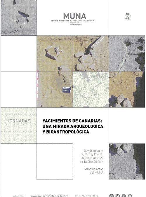 Durante los días 26, 28 de abril y 5, 10, 12, 17, 19 de mayo de 2022, en horario de 18 a 20 horas, se celebrarán en el Salón de Actos del Museo de Naturaleza y Arqueología (MUNA, Fuente Morales, s/n. Santa Cruz de Tenerife) las Jornadas científico-divulgativas sobre arqueología/bioantropología canaria, que este año llevan por título Yacimientos de Canarias: una mirada arqueológica y bioantropológica, organizadas por el Museo Arqueológico de Tenerife y el Instituto Canario de Bioantropología, pertenecientes al Organismo Autónomo Museos y Centros del Cabildo de Tenerife.