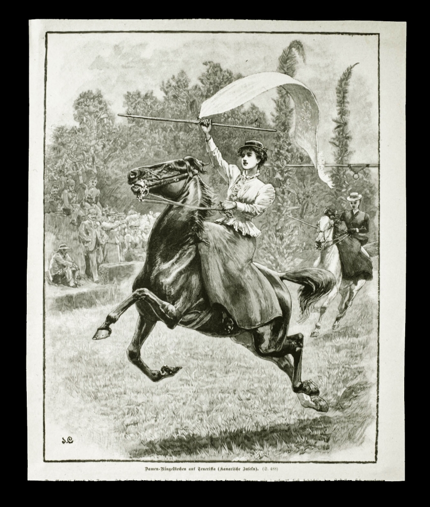 En estas carreras, doce jinetes en total de los que tres eran mujeres, competían uno tras otro, con una pequeña lanza de madera al tiempo que galopaban por debajo de la barra; después de cada ronda volvían al punto de partida con el trofeo recién conseguido expuesto sobre el pecho a modo de fajín...