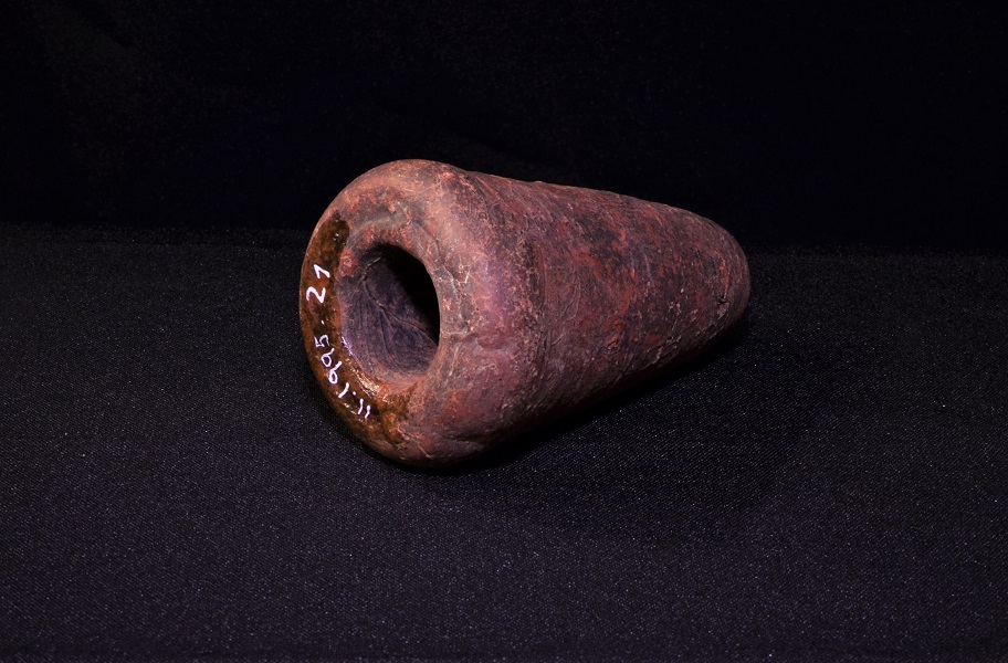 El azúcar fue el producto más exportado desde la finalización de la conquista hasta mediados del siglo XVI, posibilitando con ello la integración de las Islas Canarias en los circuitos comerciales internacionales. La cultura material relacionada se manifestó, en lo que a recipientes se refiere, en tres tipologías básicas tanto de barro como de cerámica: formas (u hormas de azúcar), tipos y porrones. Los conos como el que mostramos (conservado en los almacenes del Museo), también denominados moldes de pan de azúcar, quedan encuadrados en la primera tipología. Su peculiar forma cónica procede de aquellos otros que se empleaban en la fase ya aludida de purgado, proceso en el que los despurgadores, operarios especializados, depositaban durante todo un día el jugo granujiento extraído de la caña ya cocido, la melaza, dentro de las citadas formas. Transcurridas veinticuatro horas se quitaba el cogollo de caña que actuaba a modo de tapa en el orificio o respiradero abierto en el vértice del cono para que la miel se purgara, recogiéndose una vez purgada en unos recipientes llamados “trastos”. Esta era la fase decisiva en la elaboración del producto pues, de la misma, dependía su calidad, y, por extensión, su comercialización.