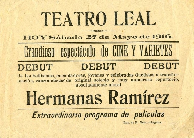 Programa de mano del Teatro Leal del 27 de mayo de 1916 en el que se anuncia un espectáculo de cine y varietés de las Hermanas Ramírez. Imp. de N. Vera, La Laguna.