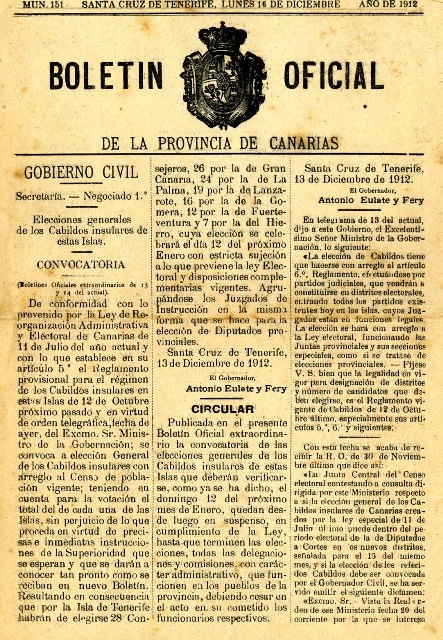 Tidbits: «Boletín Oficial de la Provincia de Canarias de 1912 en el que se convocan elecciones generales de Cabildos Insulares»