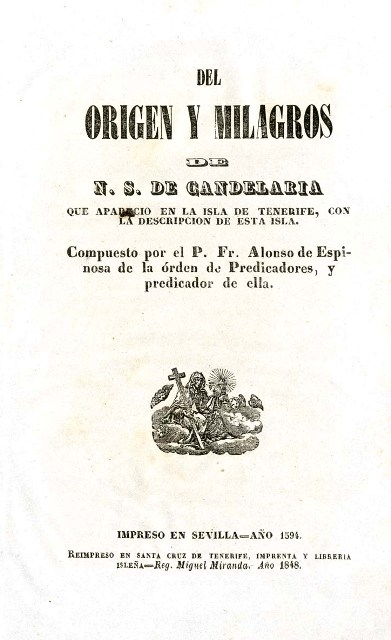 ESPINOSA, Alonso de (Fray). Del origen y milagros de N.S. de Candelaria que apareció en la isla de Tenerife, con la descripción de esta isla. Santa Cruz de Tenerife: Imprenta y Librería Isleña, 1848. 95 p. Contiene: Libro Primero. De la descripción de la isla de Tenerife, de su fertilidad, de la gente y costumbres de los naturales della — Libro Segundo. Del origen y aparecimiento de la santa Imagen de Candelaria — Libro Tercero. De la conquista de la isla de Tenerife y de lo sucedido en ella hasta el años de 1558