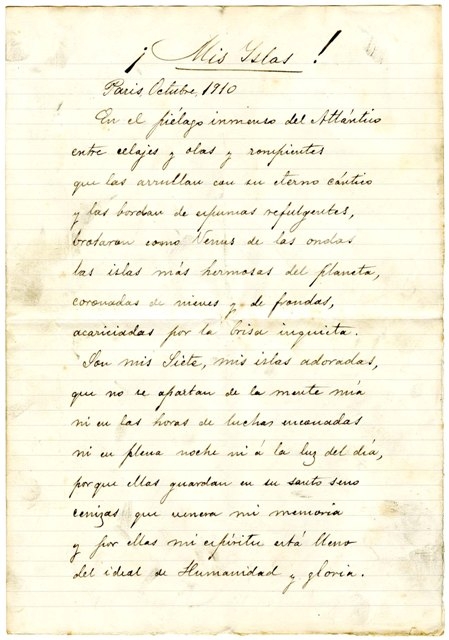 Desde el CEDOCAM celebramos este Día de Canarias con un maravilloso poema de Nicolás Estévanez titulado ¡Mis Islas! y que escribe en París en octubre de 1910. Nicolás Estévanez y Murphy nació en Gran Canaria el 17 de febrero de 1838. Luego se trasladó a Tenerife y vivió largas temporadas en la casa familiar de Gracia, en La Laguna. Fue un liberal y un republicano, un poeta y un rebelde, que abandonó su carrera militar en La Habana tras el fusilamiento de unos jóvenes estudiantes cubanos. Poeta de raigambre regionalista que anticipa, en alguna medida, el sentimiento doloroso del 98. Murió en París el 19 de agosto de 1914.