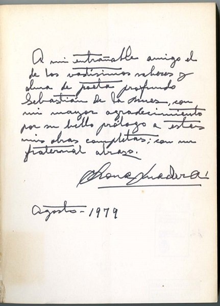 Obras completas «la poesía de Chona Madera es, a pesar de su continua nostalgia de lo pasado, de lo perdido, de los muertos amados, esencialmente vitalista». Chona Madera murió en Las Palmas de Gran Canaria en 1980. La imagen elegida para ilustrar este Intemporal es una dedicatoria a Sebastián de la Nuez, prologuista de sus