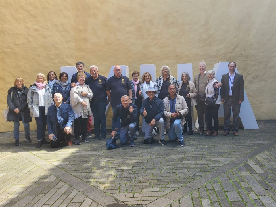 Grupo de visitantes frente a las letras del museo y acompañados por el técnico Jesús Duque