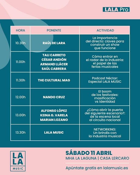 Dentro de la programación de Lala Music, Festival de música emergente hecha en Canarias, estaría Lala Pro, espacio formativo y de networking, con charlas, talleres y mesas redondas impartidas por profesionales de la industria musical —como managers, productores y programadores de festivales—, dirigido a artistas emergentes, y enfocado en internacionalización, digitalización y profesionalización desde la realidad ultraperiférica.