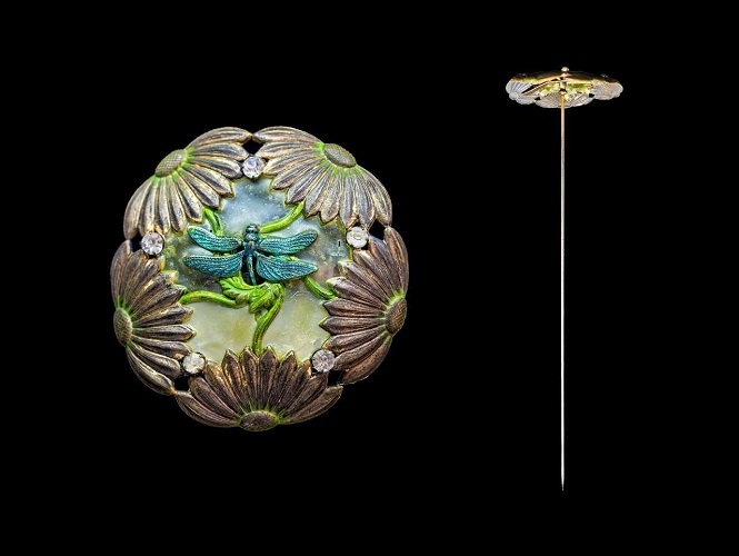 El estilo modernista (Art Noveau), al que pertenece por su decoración este alfiler, fue una tendencia decorativa de las últimas décadas del siglo XIX, estando en auge hasta la primera guerra mundial. Se conoció en otros países con otros nombres: en Italia stile Liberty; en Escandinavia Jugendstil … Se caracterizaba por el uso de líneas curvas, sinuosas, que se transmitían a figuras femeninas, de poses lánguidas, con grandes melenas que adquirían esas mismas formas y por el uso de elementos del mundo animal y vegetal, como podemos observar en este alfiler.