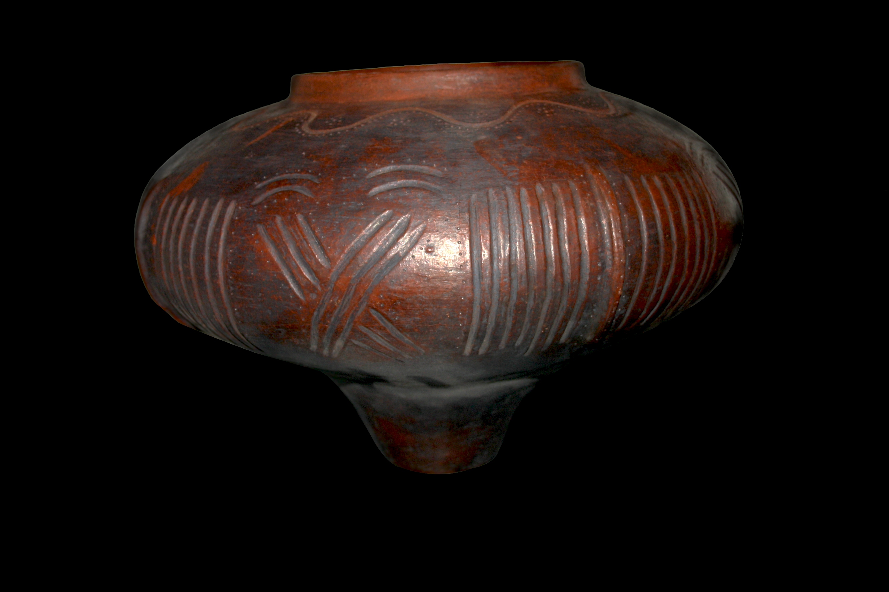 Se trata, por tanto, de una pieza de barro con la base plana y muy estrecha, la cual se va ensanchando progresivamente hacia un gran cuerpo oval y achatado con labio plano en la parte alta. Está decorada en todo el cuerpo con incisiones a modo de cruces, puntos y diversos motivos geométricos, así como con protuberancias o resaltes en su zona cóncava, que demuestran el uso de diferentes utensilios de marcado antes del proceso de cocción de la pieza.