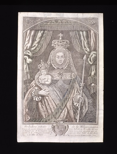 La colección de grabados del Museo de Historia y Antropología de Tenerife está constituida mayoritariamente por panorámicas de la costa de la isla y escenas costumbristas representativas de la misma, todas ellas en torno al siglo XIX. No obstante, hay algunas excepciones en lo que a temática se refiere y una de ellas no es otra que este grabado sobre la vera efigie de la Virgen de Candelaria. El conocido episodio relacionado con ella ha sido asociado tradicionalmente al relato del abate Espinosa, cuya primera edición es de 1594, el cual continuaron los poetas Cairasco y Viana, e, igualmente, a las informaciones aportadas por el padre Juan González de Mendoza desde 1585, relato que fue reproducido por Diego Pérez de Mesa en Grandeza y cosas notables de España. Pero las narraciones escritas sobre aquellos dos guanches del menceyato de Güímar que al pasar cerca del barranco de Chimisay vieron como el rebaño no prosiguió su camino y al adelantarse uno de los pastores para conocer lo que pasaba y al mirar hacia la parte del mar observó la santa imagen sobre una peña imagen, nunca pudieron competir con la asimilación de un culto que ha perdurado hasta nuestros días y que ha tenido en la iconografía a uno de sus máximos exponentes.