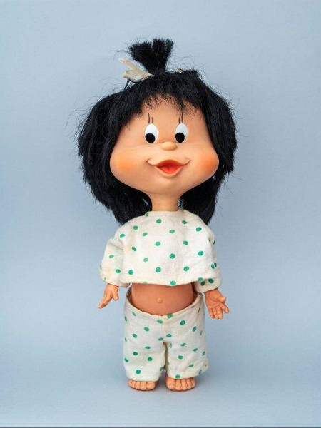 Esta muñeca, de finales de los años 60 del siglo XX, representa al personaje conocido como «Cleo» de la famosa y televisiva Familia Telerín. De pequeño formato (sus medidas son 33x12x10 cm), está fabricada en plástico rígido, a excepción de su cabeza que es de plástico blando. Tanto ésta como los brazos son articulados, lo que permite el giro de estos elementos, mientras que las piernas son fijas a modo de prolongación del cuerpo. La cabeza posee pelo negro (de materia artificial) incrustado, flequillo encolado y pequeña coleta en la parte alta rematada con lazo de raso de color beige. Tiene grandes ojos dotados de igualmente grandes pestañas y boca abierta mostrando una amplia sonrisa en la que se observa, asomando atrevida, su lengua, así como unos hermosos mofletes rojos. Viste un pijama blanco amarfilado con lunares de color verde, aunque en las versiones más comunes los lunares eran rojos o azules; el pantalón se ajusta a la cintura con elástico y la camisa se cierra con dos broches de presión en la parte trasera, siendo más corta en su parte delantera para dejar ver el ombligo. Donada al Museo de Historia y Antropología de Tenerife en el año 2018, entró a formar parte de la colección de juegos y deportes.