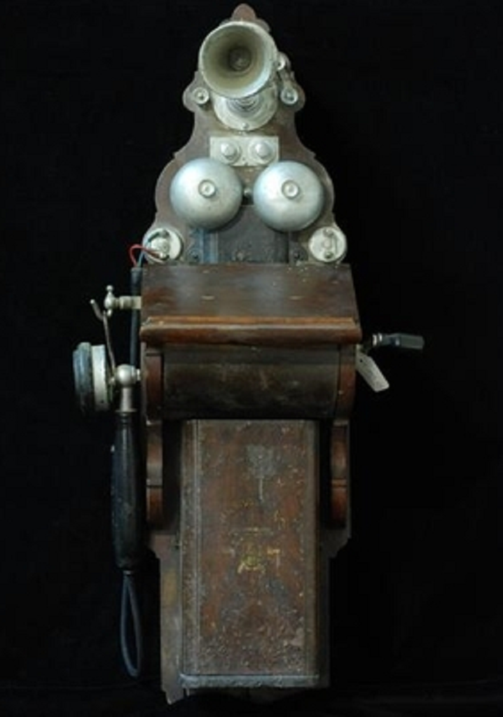 Este teléfono de pared, de la marca sueca Ericsson, modelo popularmente conocido como “Pulpit” porque su peculiar diseño recuerda a los púlpitos de las iglesias escandinavas, comenzó a fabricarse en 1882 y con ligeras variantes siguió fabricándose durante décadas. Formado por un cuerpo de madera maciza, en el que se insertaban un grupo de piezas exteriores metálicas (micrófono fijo, doble campana y auricular), presenta en el centro un pequeño atril a modo de escritorio con tapa. La pieza se completa con una parte inferior metálica decorada con la calcomanía de la fábrica, que ocultaba la batería. Instalado para hablar de pie, mediante la manivela se activaba el dispositivo para establecer la conexión con la centralita, mientras que el receptor o auricular, a la izquierda, iba apoyado en el conmutador de conexión/desconexión del teléfono.
