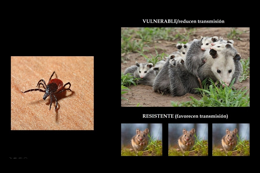 Además, según expresan los autores antes mentados, Kessing et al. (2010), las especies que sobreviven a la pérdida de biodiversidad (las más resistentes, por ejemplo, roedores, más dañinas para los humanos) parecen ser las que más eficazmente transportan y expanden enfermedades. El resultado es que aumenta la densidad de las especies portadoras, lo que incrementa, a su vez, la posibilidad de contagios. Para ilustrar el papel que desarrollan distintas especies en la propagación de enfermedades, los investigadores citan un ejemplo: en Virginia (Estados Unidos), los ratones de pies blancos conviven con zarigüeyas (marsupiales americanos). A ambos ataca la garrapata de patas negras, que contagia la enfermedad de Lyme. Este parásito entra en contacto con la bacteria patógena al alimentarse de su huésped. La diferencia es que las zarigüeyas saben eliminar las garrapatas, deshacerse de ellas, mientras que los ratones, no. Como resultado, los marsupiales no solo portan menos garrapatas, sino que aquellas a las que alimentan tienen menos posibilidades de entrar en contacto con el agente patógeno. Por el contrario, los ratones de pies blancos son un campo abonado para la propagación de parásitos, y las garrapatas que se nutren de ellos acaban casi siempre infectándose con la bacteria.