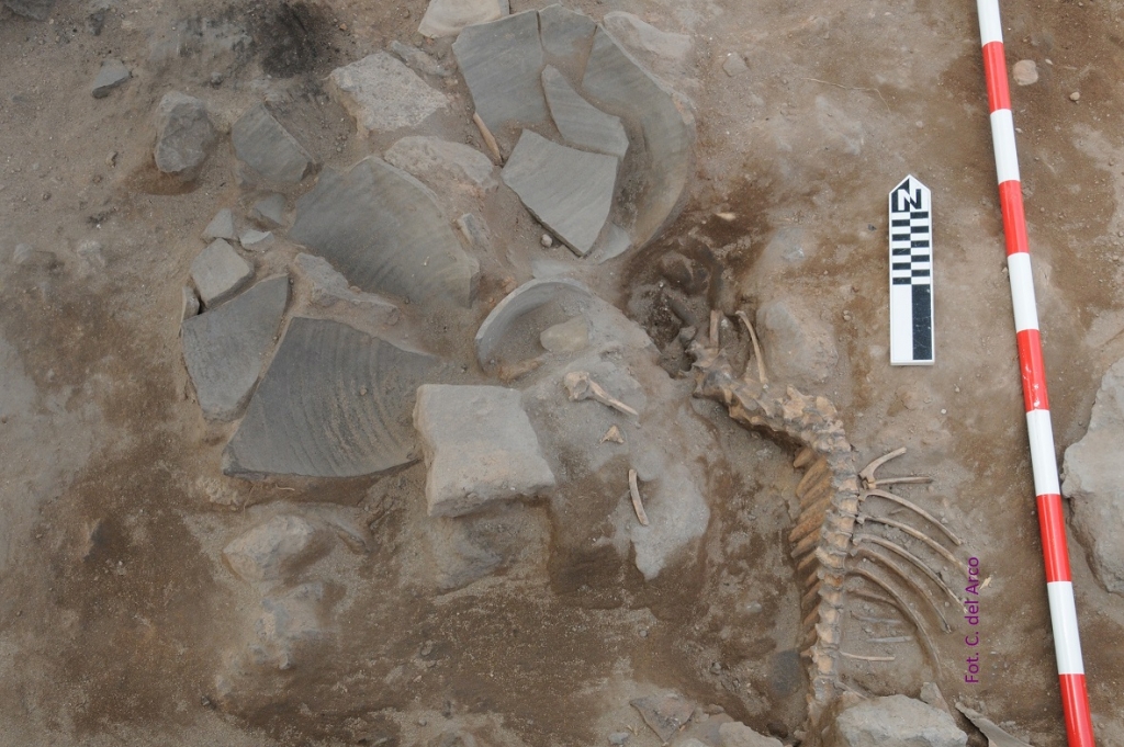 Las cerámicas de Lobos aparecen agrupadas en determinadas zonas o dispersos, en amplias superficies, a veces, junto a otros materiales (Fot.2). En nuestro yacimiento distinguimos varias áreas de actividad, espacios de producción del tinte púrpura, los concheros, espacios la vida cotidiana, unos de ámbito doméstico con zonas destinadas a la preparación de alimentos hasta que son consumidos y que nos proporcionan distintos tipos de cerámica, pero también espacios arquitectónicos, probablemente para el almacenaje y descanso, y espacios basurero, con vertidos de restos diversos, orgánicos e inorgánicos.