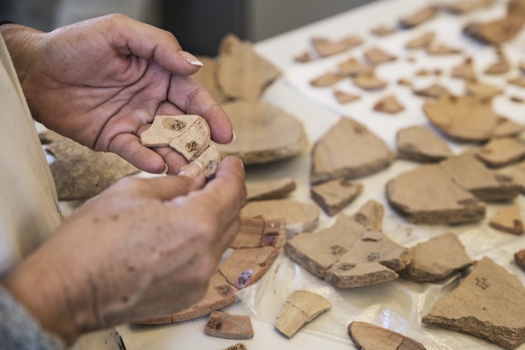 Parecería un trabajo tedioso y rutinario, pero es el que nos facilita ir descubriendo aspectos muy variados, tecnológicos como la composición de las pastas, el acabado de las superficies, las alteraciones por desgastes funcionales o postdeposicionales, y su atribución a un determinado tipo de recipiente y a una parte de los mismo. Manejar de manera intensa con un alto grado de observación desde el comienzo permite pues iniciar una clasificación con agrupaciones y un inicio del proceso de remontaje y reconstrucción de las piezas (Fot.4), trabajo que no nos ocupa todo nuestro tiempo pues tenemos que combinarlo con otras tareas de nuestro quehacer museístico.
