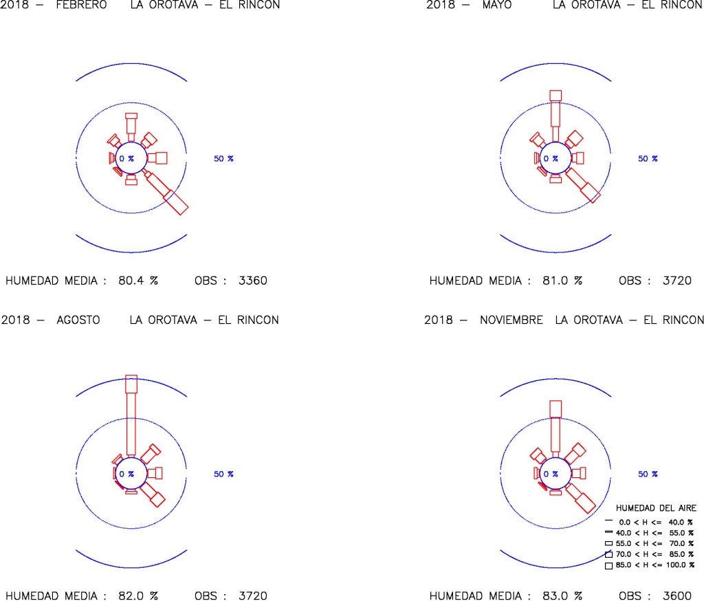 Figura 1. Rosas de humedad mensuales 2018 entre plataneras en la costa oriental del Valle de la Orotava, El Rincón a 216 m. Los vientos son débiles y en la dirección norte son dominantes. Régimen de vientos afín al efecto meteorológico brisas de mar y brisas de tierra. Durante el día, la atmósfera marina se calienta por la incidencia de los rayos solares, aumenta su energía cinética, el aire es más ligero y húmedo, se ve obligado ascender a lo largo de la superficie inclinada del Valle, soplan vientos débiles con componente norte. Durante la noche, la atmósfera de la cumbre se enfría notablemente, pérdida de energía calorífica por irradiación hacia el espacio en forma de radiación infrarroja, el aire se hace más denso, más pesado y ligeramente más seco, se desploma hacia el mar, canalizado por el declive escarpado occidental del Valle, laderas de La Florida y La Resbala, soplan vientos muy débiles del sector noreste a sureste. En febrero los vientos soplan en todas las direcciones, vientos semihúmedos a muy húmedos en la dirección norte son frecuentes y vientos semisecos a muy húmedos en la dirección sureste son dominantes En mayo los vientos soplan en todas las direcciones, vientos semihúmedos a muy húmedos en la dirección sureste son frecuentes y vientos semihúmedos a muy húmedos en la dirección norte son dominantes. En agosto los vientos soplan en el sector noroeste a sur, vientos húmedos a muy húmedos en la dirección sureste son frecuentes y vientos semihúmedos a muy húmedos en la dirección norte son dominantes. En noviembre los vientos soplan en todas las direcciones, vientos húmedos a muy húmedos en la dirección sureste son frecuentes y vientos semihúmedos a muy húmedos en la dirección norte son dominantes.