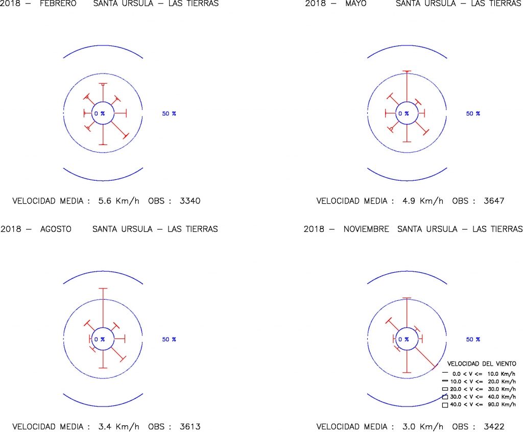Figura 2. Rosas de viento mensuales entre viñedos en la medianía oriental externa al Valle de la Orotava, Santa Úrsula – Las Tierras a 530 m. Los vientos débiles soplan en todas las direcciones, en la dirección sur son frecuentes y en la dirección norte son dominantes, direcciones del eje de la vertiente nororiental de la isla, entre la costa y la cordillera Dorsal. En febrero los vientos soplan en todas las direcciones, vientos débiles e incluso moderados, en el sector sureste a sur y en la dirección norte son frecuentes. En mayo los vientos soplan en todas las direcciones, vientos débiles e incluso moderados, en el sector sureste a noroeste son frecuentes y en la dirección norte son dominantes. En agosto y noviembre los vientos soplan en todas las direcciones, vientos débiles, en el sector sureste a sur son frecuentes y en la dirección norte son dominantes.