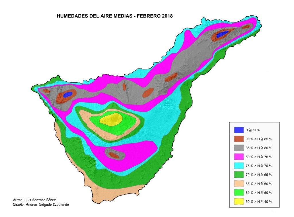 Figura 3. Mapa esquemático de las líneas higrométricas medias en FEBRERO 2018. La amplia franja longitudinal continua de medianías altas de la vertiente norte entre las cotas 700 m a 1250 m, desde el macizo de Teno a la cordillera de Anaga, y zonas aisladas de los pinares de Granadilla y Vilaflor, donde la humedad del aire media es superior al 85 %, las zonas más húmedas de la isla; además existen dos núcleos poco extensos, zonas de crestería cubierta de laurisilva exuberante donde la humedad es superior al 90 %, zonas de nieblas casi permanentes. La franja longitudinal continua de medianías, excepto en los municipios de Güimar y Arico, entre las cotas 500 m a 700 m, zonas cultivables y casi por completo la Corona Forestal que circunvala la isla, la humedad del aire media está comprendida entre 80 % a 85 %, las zonas húmedas donde suelen estar cubiertas de nubosidad estratiforme orográfica. La superficie cerrada de alta montaña, zona central insular, es la zona menos húmeda, humedad del aire media inferior al 65 %, y su cuantía desciende paulatinamente hasta alcanzar valores mínimos en la cumbre del Teide, espacio limitado de humedades inferiores al 40 %; también una estrecha franja costera sur sureste a noroeste, cotas inferiores a 100 m, es un espacio de humedad ambiental no destacable, humedad inferior al 65 %.