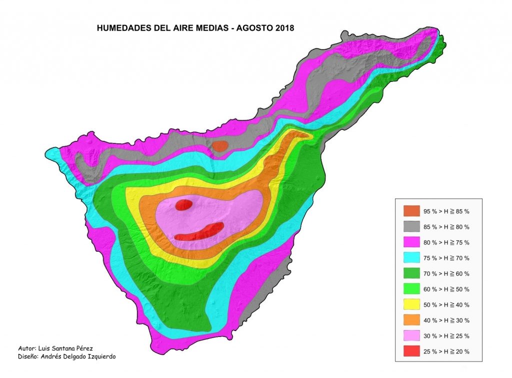 Figura 4. Mapa esquemático de las líneas higrométricas medias en AGOSTO 2018. Las estrechas franjas costeras norte a noreste y sureste a sur sureste, cotas inferiores a 100 m y la estrecha franja longitudinal continua de medianías de las vertientes norte entre las cotas 500 m a 800 m, desde el macizo de Teno a la crestería de la cordillera de Anaga, la humedad del aire media es superior al 85 %, las zonas más húmedas de la isla; además existe un núcleo poco extenso, pared de Tigaiga tapizada de monteverde inducida por el alisio, donde la humedad ambiental es superior al 90 %, presencia de estratocúmulos orográficos casi permanentes. La franja longitudinal continua de costa y medianía rodea la franja húmeda en las vertientes norte en cotas inferiores 1250 m, excepto laderas orientales macizo de Teno, cultivos de viñedos y hortícolas, monteverde y pinar bajo; franja costera en las vertientes sureste a noreste en cotas inferiores a 200 m; la humedad del aire media está comprendida entre 80 % a 85 %, zonas húmedas donde soplan vientos marinos septentrionales intensos. La superficie cerrada de montaña a alta montaña, zona central insular, es la zona seca, humedad del aire media inferior al 50 %, y su cuantía desciende paulatinamente hasta alcanzar valores mínimos en la cumbre del Teide, espacio limitado de humedades inferiores al 25 %.