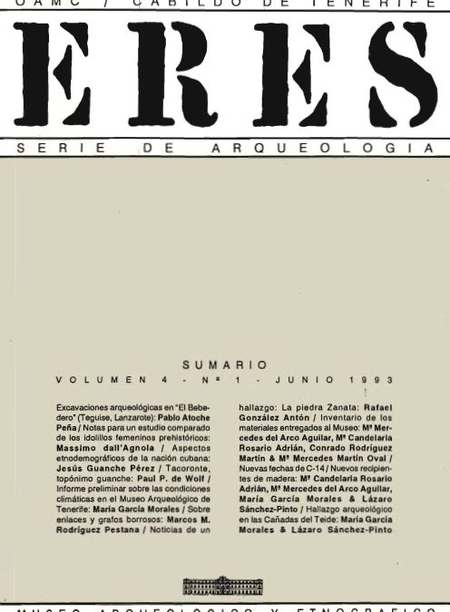 Excavaciones arqueológicas en «El Bebedero» (Teguise, Lanzarote). Segunda campaña, 1987: P. Atoche Peña/ Notas para un estudio comparado de los idolillos femeninos prehistóricos: M. Dall’Agnola/ Aspectos etnodemográficos de la nación cubana: problemas y fuentes de estudio: J. Guanche Pérez/ Tacoronte, topónimo guanche: P.P. de Wolf/ Informe preliminar sobre las condiciones climáticas en el Museo Arqueológico de Tenerife: M. García Morales/ Sobre enlaces y grafos borrosos y su aplicación en el análisis de agrupaciones en Arqueología: M.M. Rodríguez Pestana/ Noticias de un hallazgo: la piedra Zanata: R. González Antón/ Inventario de los materiales entregados al Museo Arqueológico y Etnográfico de Tenerife por la familia Bauza Castro: M. del Arco Aguilar et al./ Nuevos recipientes de madera del Museo Arqueológico de Tenerife: M.C. Rosario Adrián et al./ Hallazgo arqueológico en las Cañadas del Teide: M. García Morales y L. Sánchez-Pinto.