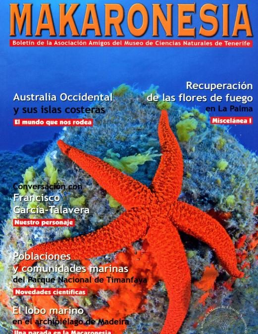 Tras la memoria de actividades de la Asociación se desarrolla, en la sección “Una parada en la Macaronesia”, uno de los textos más interesantes de este número, relativo a la foca monje o “lobo marino” en el archipiélago de Madeira, cuya autora es la bióloga madeirense Rosa Pires. Otro de los artículos de mayor relevancia muestra el resultado de un estudio llevado a cabo en el Parque Nacional de Timanfaya (Lanzarote), centrado en sus poblaciones y comunidades marinas y realizado por un equipo de biólogos y geógrafos capitaneados por Manuel Carrillo y Tomás Cruz, el cual ha tenido cabida en “Novedades científicas”.
