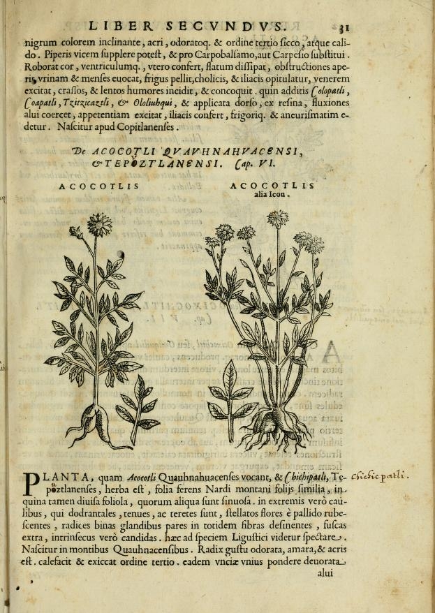 Entre todas las maravillas de la naturaleza que Francisco Hernández trajo de América se hallaban detalles de la tunera (g. Opuntia), pero también recolectó una extraña planta purgante, cuya fama se extendió por Europa en esa época, gracias a sus propiedades para dolencias de estómago, una euforbia del género Pedilanthus, así como cientos de plantas medicinales, caso del ya mentado árbol del bálsamo (Myroxylon pereirae). También otras utilizadas en alimentación, como el xochinacatzli (Cymbopetalum pendulifiorum), que se añadía al cacao para darle un gusto sumamente agradable, sabor y olor deliciosos, así como numerosos vegetales que hoy continúan usándose en jardinería, entre ellas, una especie de Magnolia, una orquídea del género Stahonpea, las flores de lis (Sprekelia formosissima) o la flor de tigre (Tigridia pavonia).